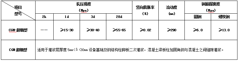 CGM-3超细型适用于:灌浆层厚度5mm<δ<30mm设备基础及钢结构柱脚板二次灌浆,混凝土梁板柱加固角钢与混凝土之间缝隙灌浆。